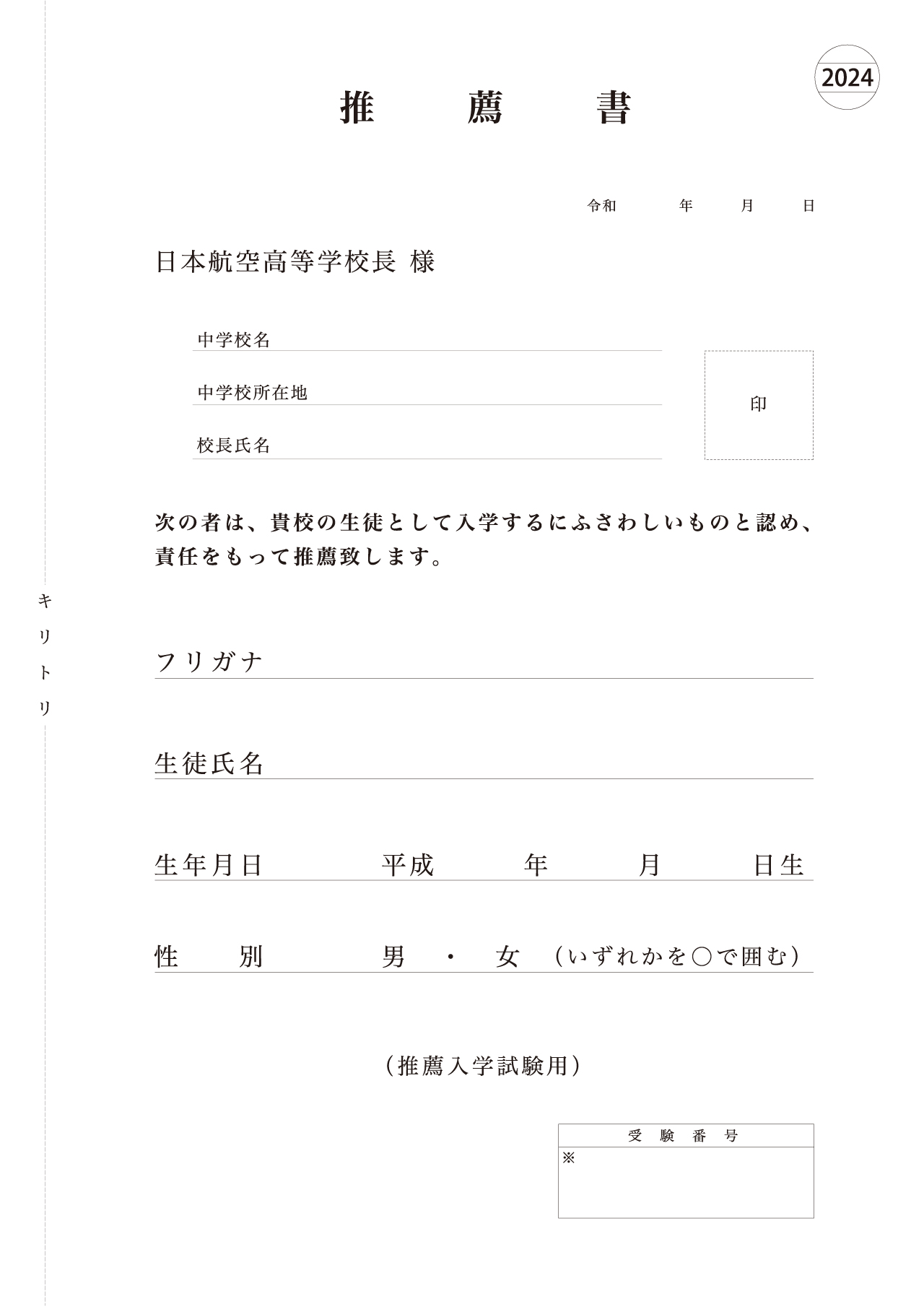 - 本校専願(単願)であること。(合格した場合には必ず入学する者)