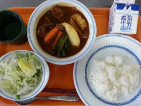 ビーフシチュー、グリーンサラダ、ライス、牛乳でした